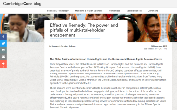 In preparation and to enhance the opportunity for dialogue on multi-stakeholder approaches to remedy at the Forum in 2017, GBI and BHRRC authored a blog entitled “Effective Remedy: The power and pitfalls of multi-stakeholder engagement”, which was published online by the Cambridge Business and Human Rights Journal. The blog shared high-level observations and insights from previous panels and background research and focussed on how multi stakeholder approaches can be used to realise effective access to remedy for victims of business-related human rights abuses, and some of the lessons learnt from past panels and research. The blog highlighted that: